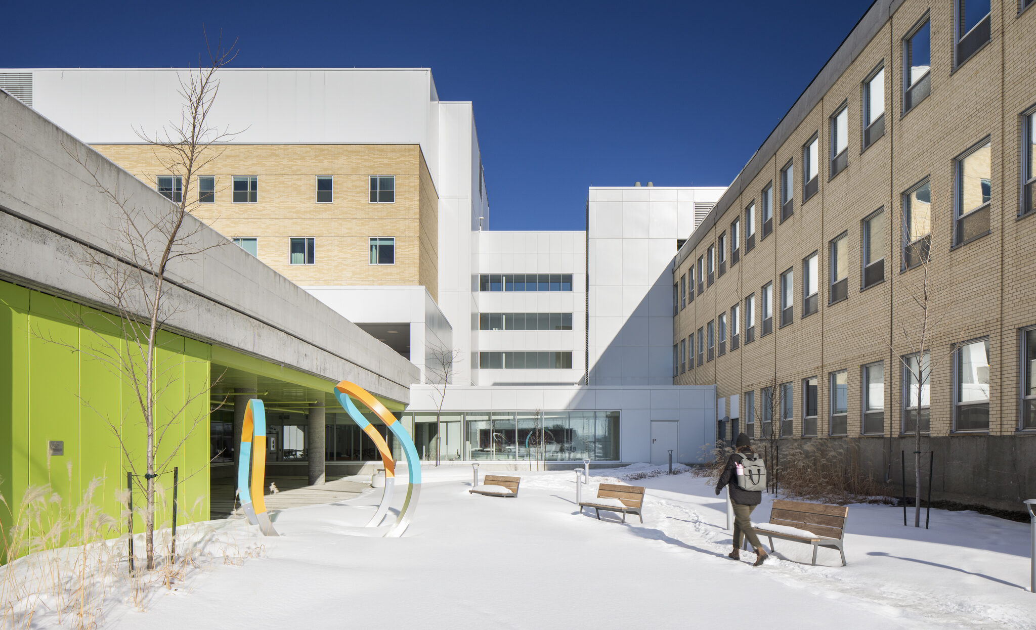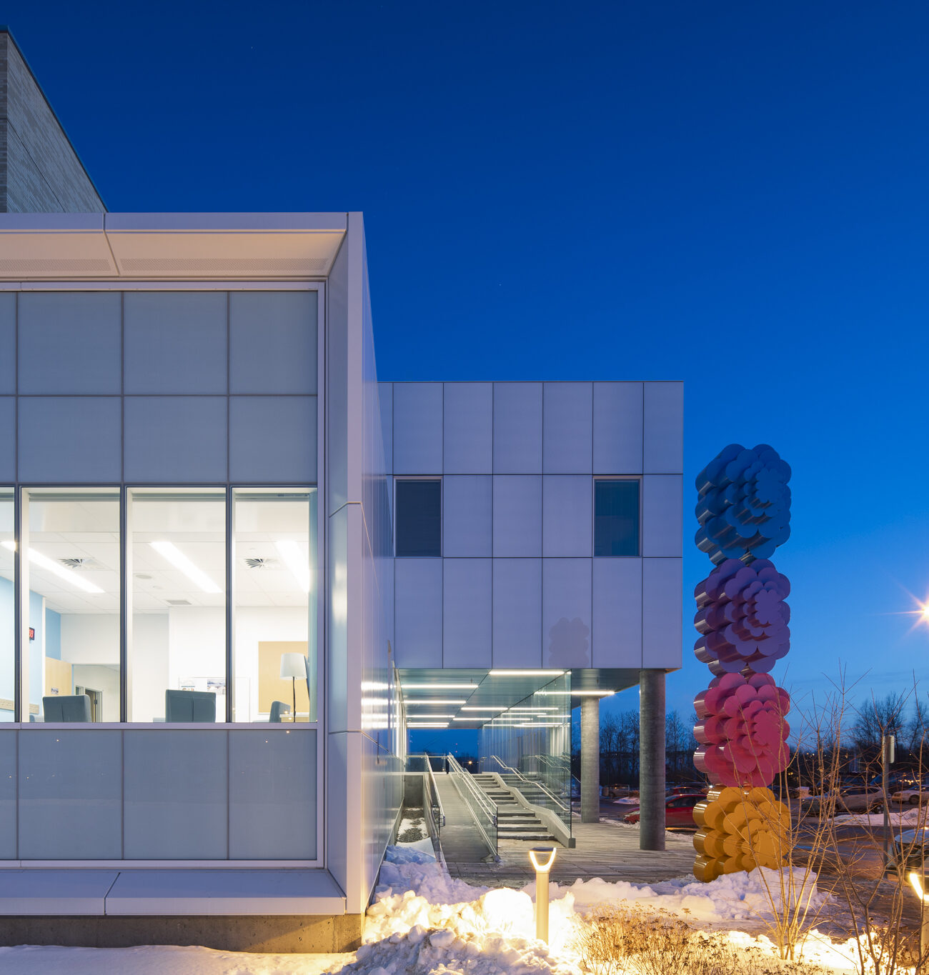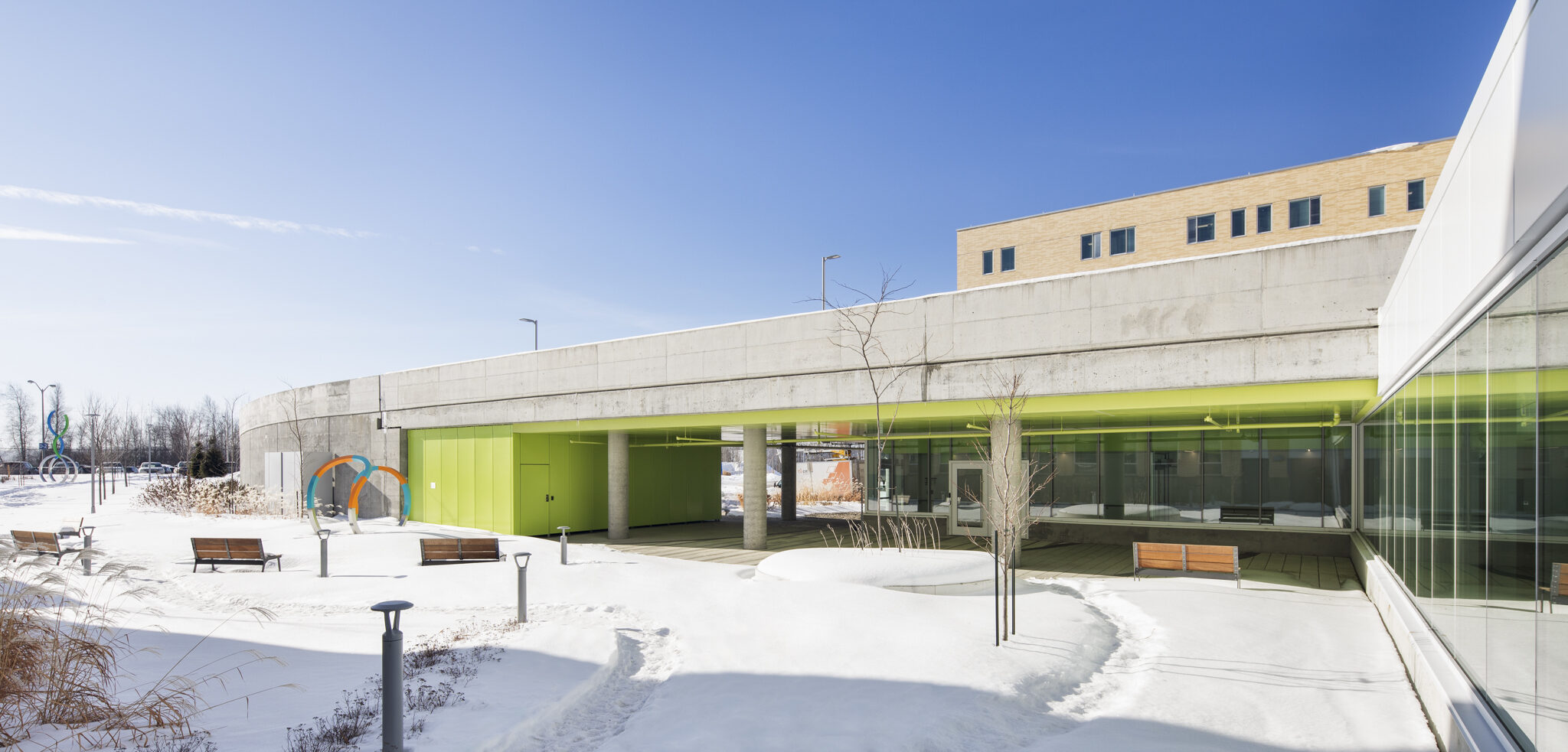 Dans le cadre de la Politique d’intégration des arts à l’architecture et à l’environnement des bâtiments et des sites gouvernementaux et publics, quatre œuvres d’art ponctuent les espaces du pavillon, offrant des expériences à la fois poétiques et accessibles. De la monumentalité colorée de Mouvance chromatique (Marc Dulude) aux sculptures ludiques de Prendre soin (Karine Payette), en passant par les installations accueillantes de Cohésion (José Luis Torres) et l’assemblage symbolique d’Orientation Cumulus (Philippe Caron Lefebvre), ces créations célèbrent la nature, la bienveillance et le vivre-ensemble. Ensemble, elles animent le quotidien, invitent à la contemplation et favorisent une appropriation sensible et humaine des lieux.