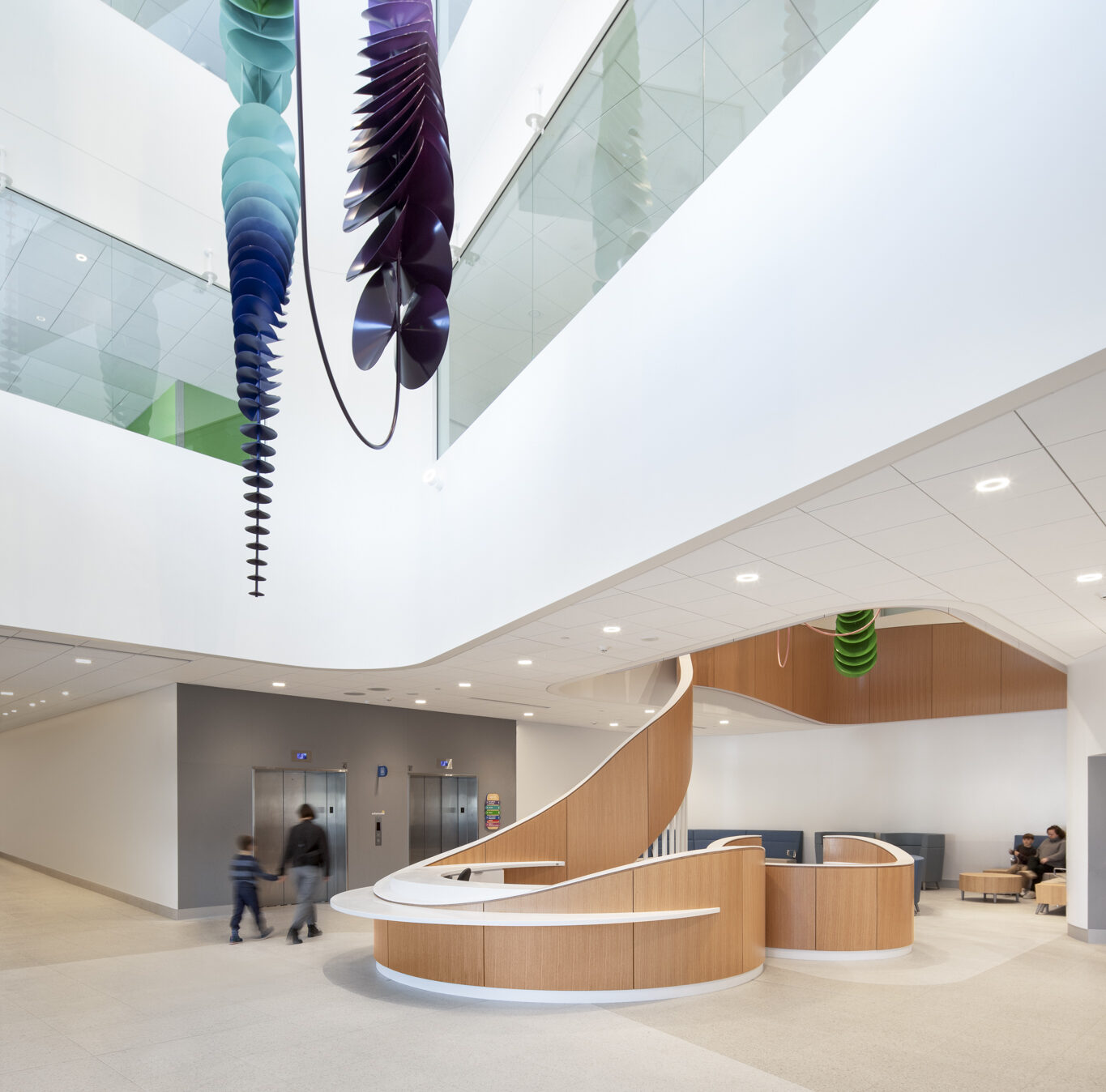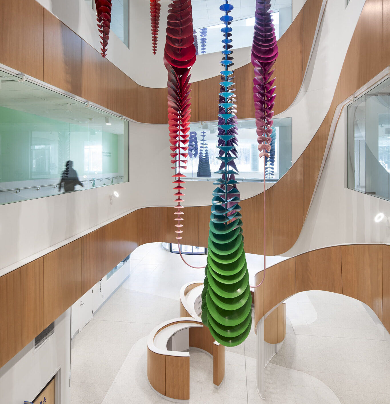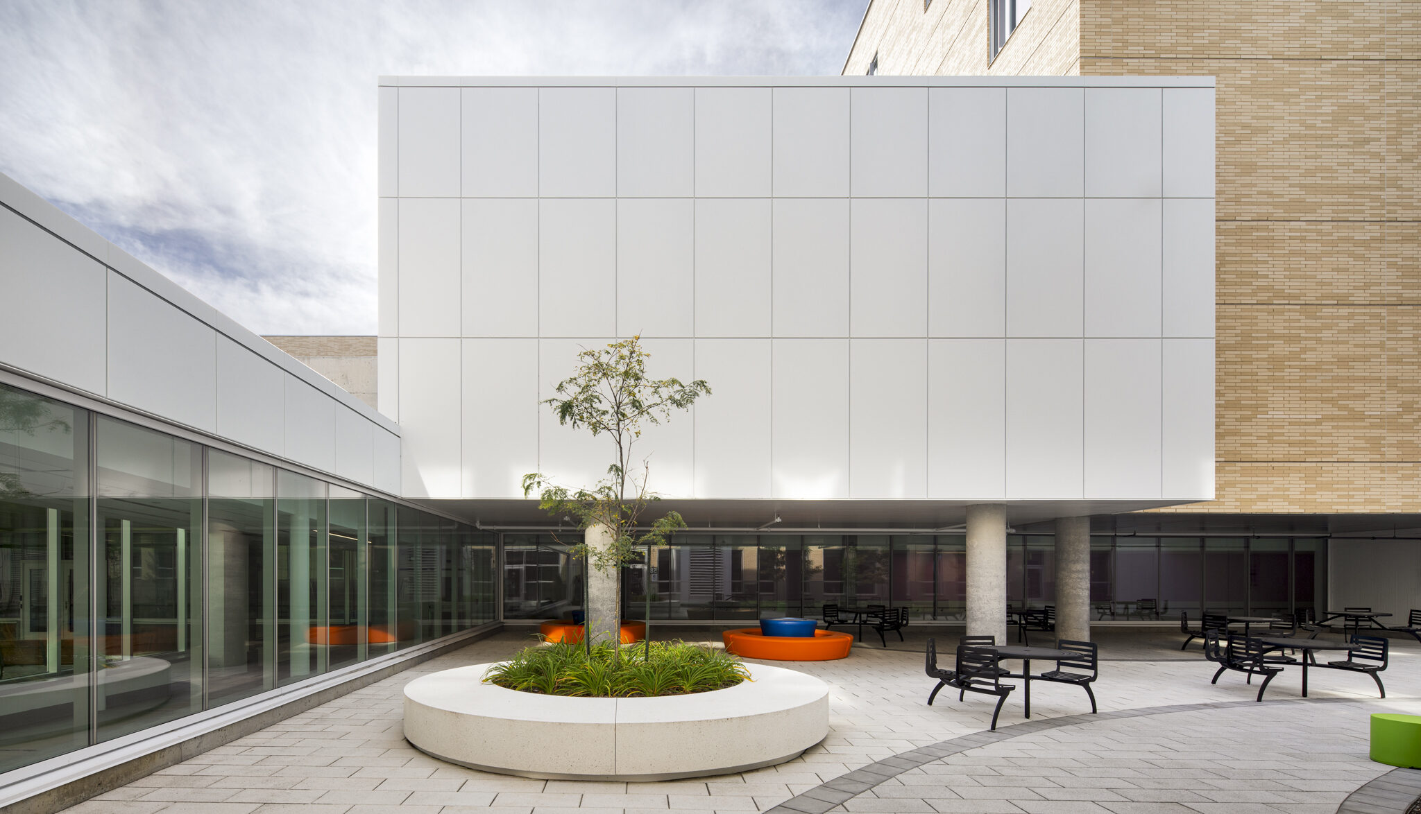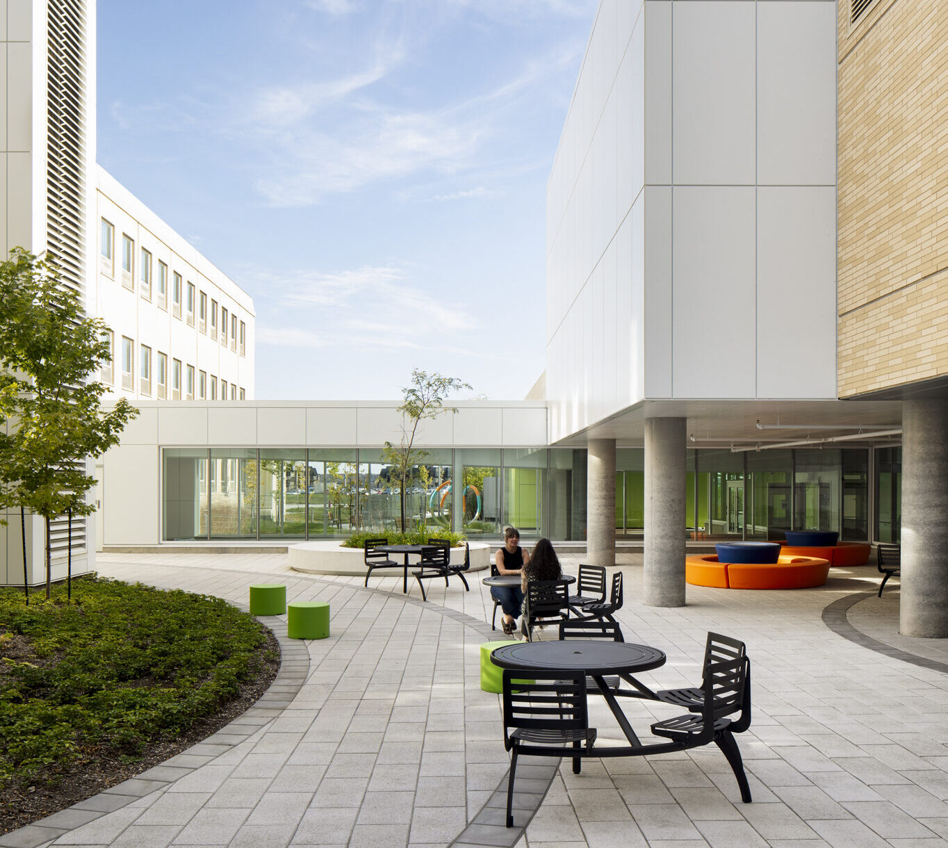 Dans le cadre de la Politique d’intégration des arts à l’architecture et à l’environnement des bâtiments et des sites gouvernementaux et publics, quatre œuvres d’art ponctuent les espaces du pavillon, offrant des expériences à la fois poétiques et accessibles. De la monumentalité colorée de Mouvance chromatique (Marc Dulude) aux sculptures ludiques de Prendre soin (Karine Payette), en passant par les installations accueillantes de Cohésion (José Luis Torres) et l’assemblage symbolique d’Orientation Cumulus (Philippe Caron Lefebvre), ces créations célèbrent la nature, la bienveillance et le vivre-ensemble. Ensemble, elles animent le quotidien, invitent à la contemplation et favorisent une appropriation sensible et humaine des lieux.
