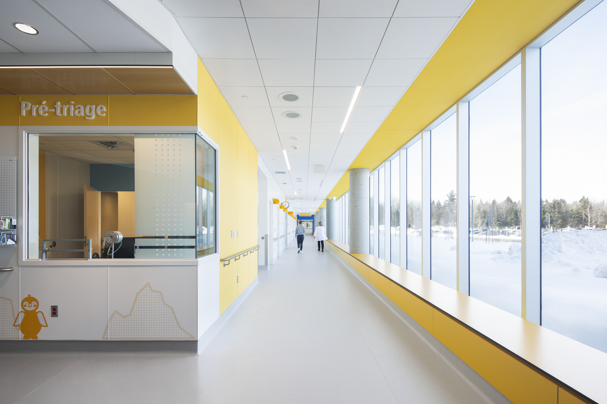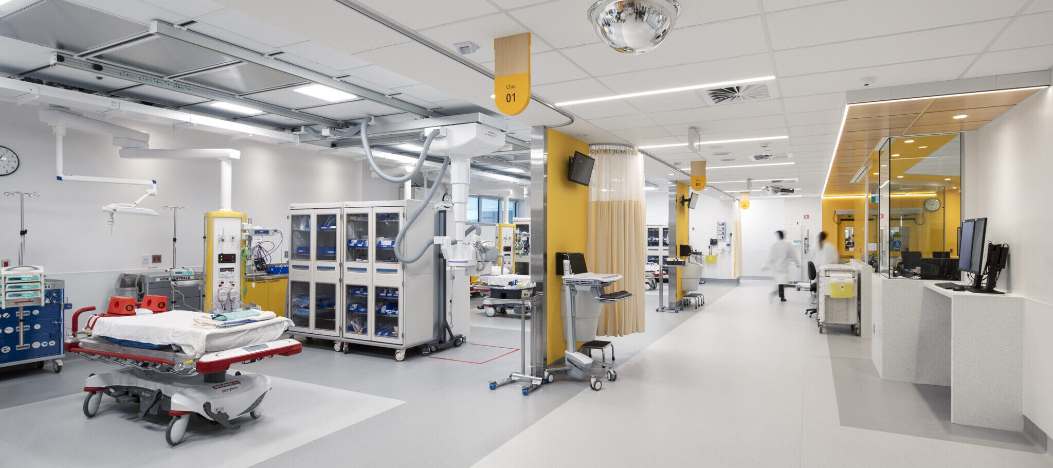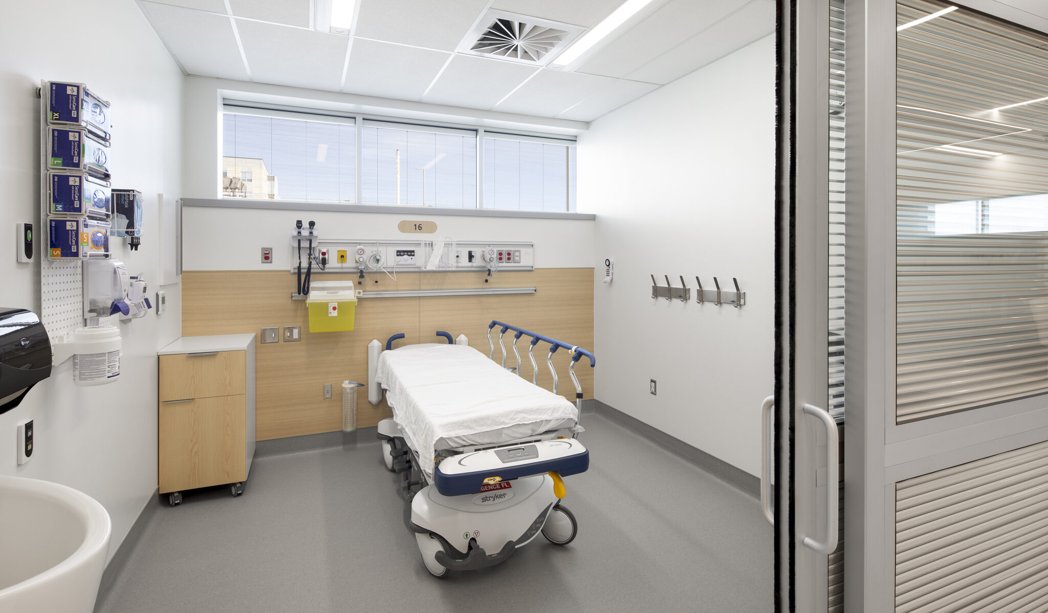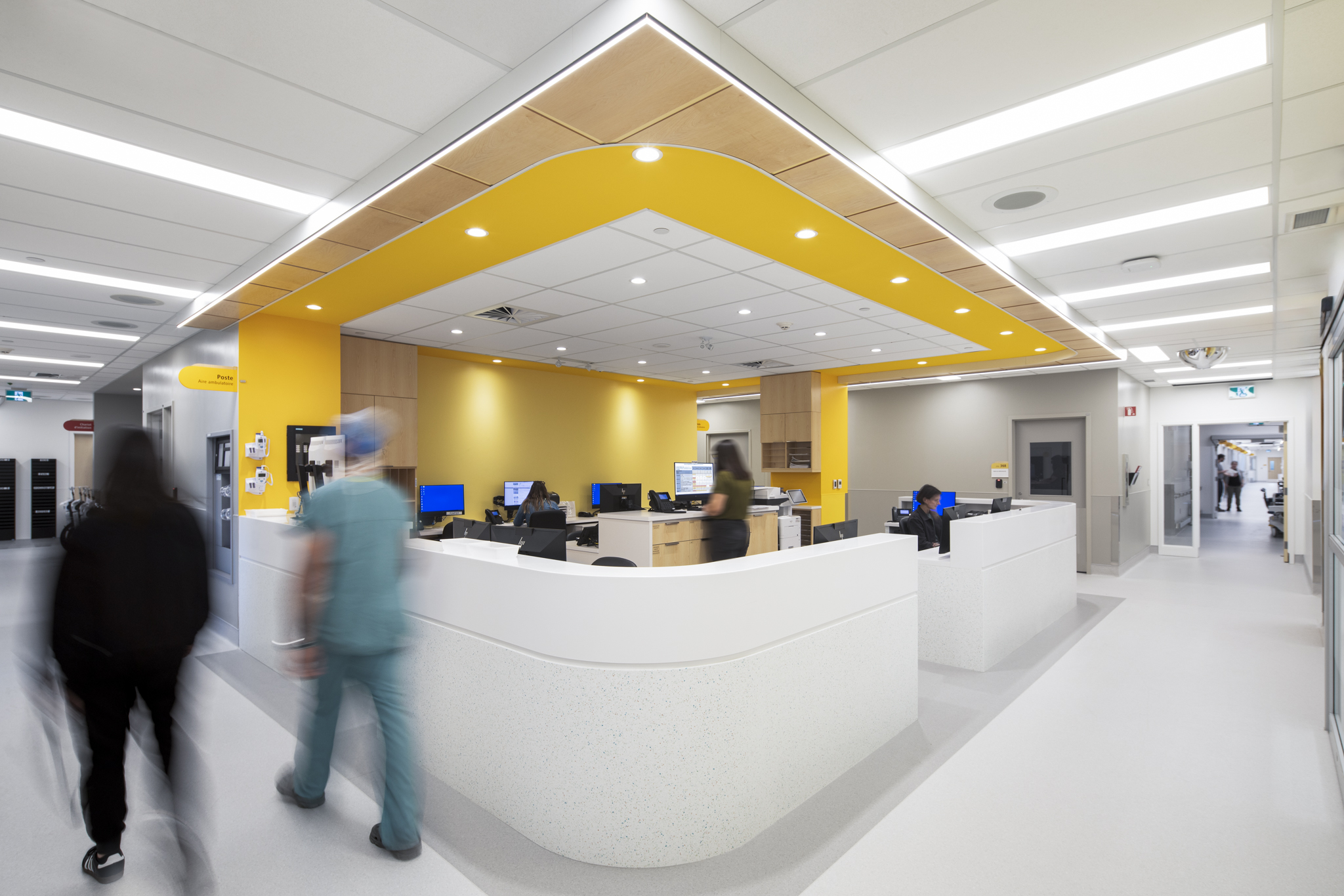 Quant à l’urgence, elle bénéficie désormais d’espaces plus vastes et mieux adaptés aux besoins du personnel comme des patients. L'établissement souhaitait désencombrer les corridors, minimiser la pollution visuelle et sonore et optimiser l'organisation des soins. Les nouvelles installations incluent entre autres une aire de choc modernisée, une zone d'évaluation rapide, 11 salles d'examen, des salles à pression négative et plus encore. La salle d’attente, plus grande, lumineuse et accueillante, offre un environnement apaisant et fonctionnel. L’ajout de salles d’observation et d’une entrée réservée aux ambulances, distincte de la zone d’attente, permet de réduire les perturbations et d’améliorer la fluidité des déplacements. Les chambres spacieuses favorisent l’efficacité du travail clinique tout en préservant l’intimité et le calme des usagers.