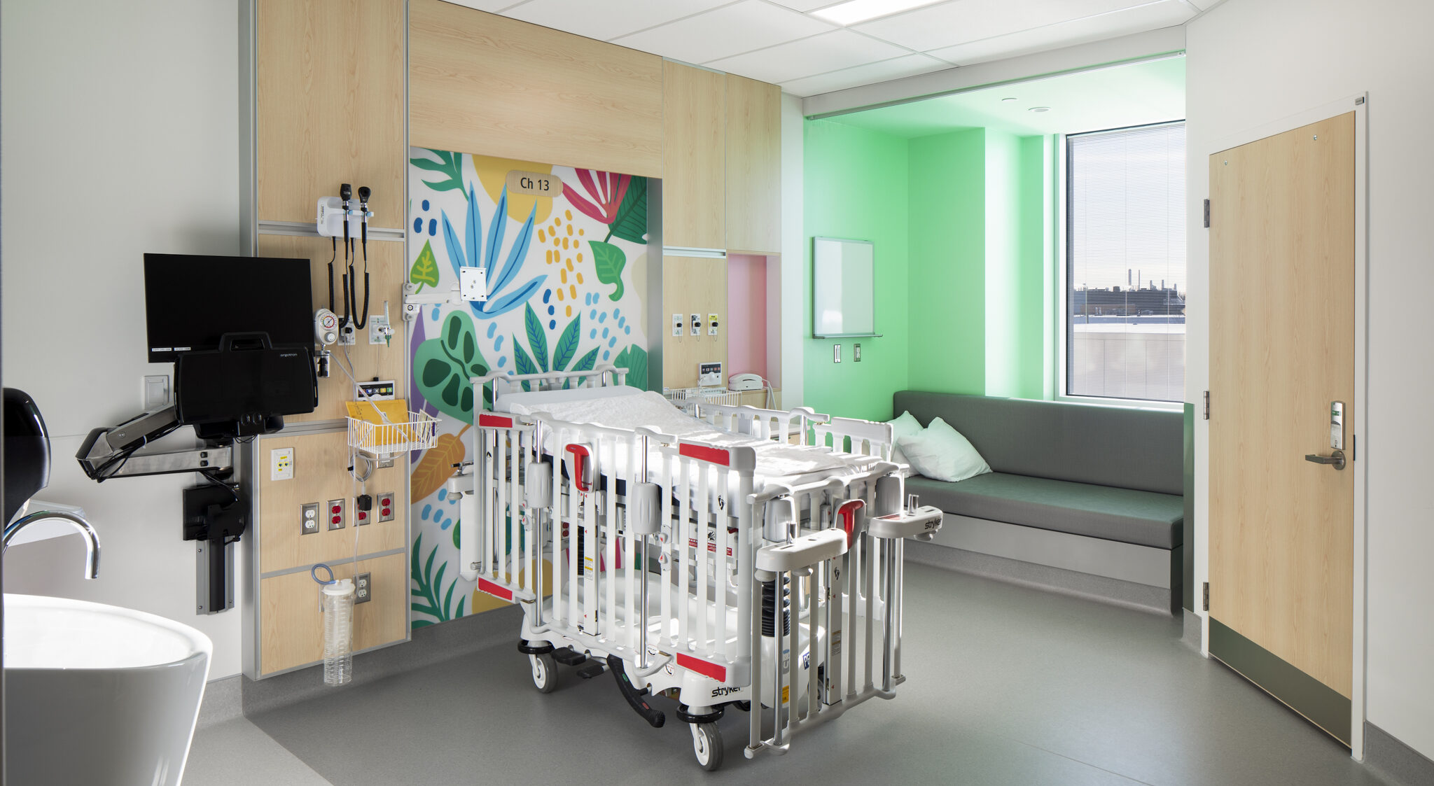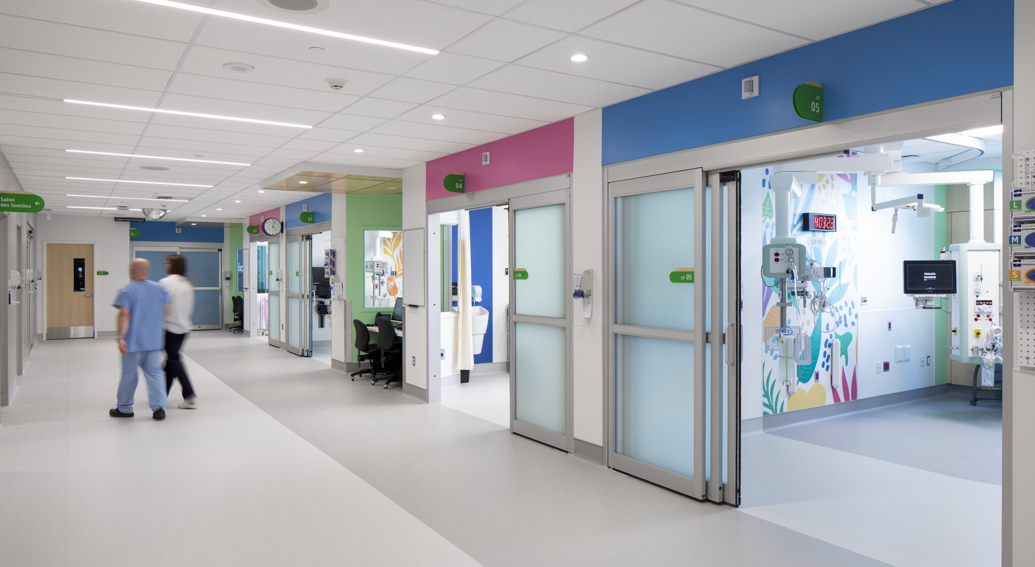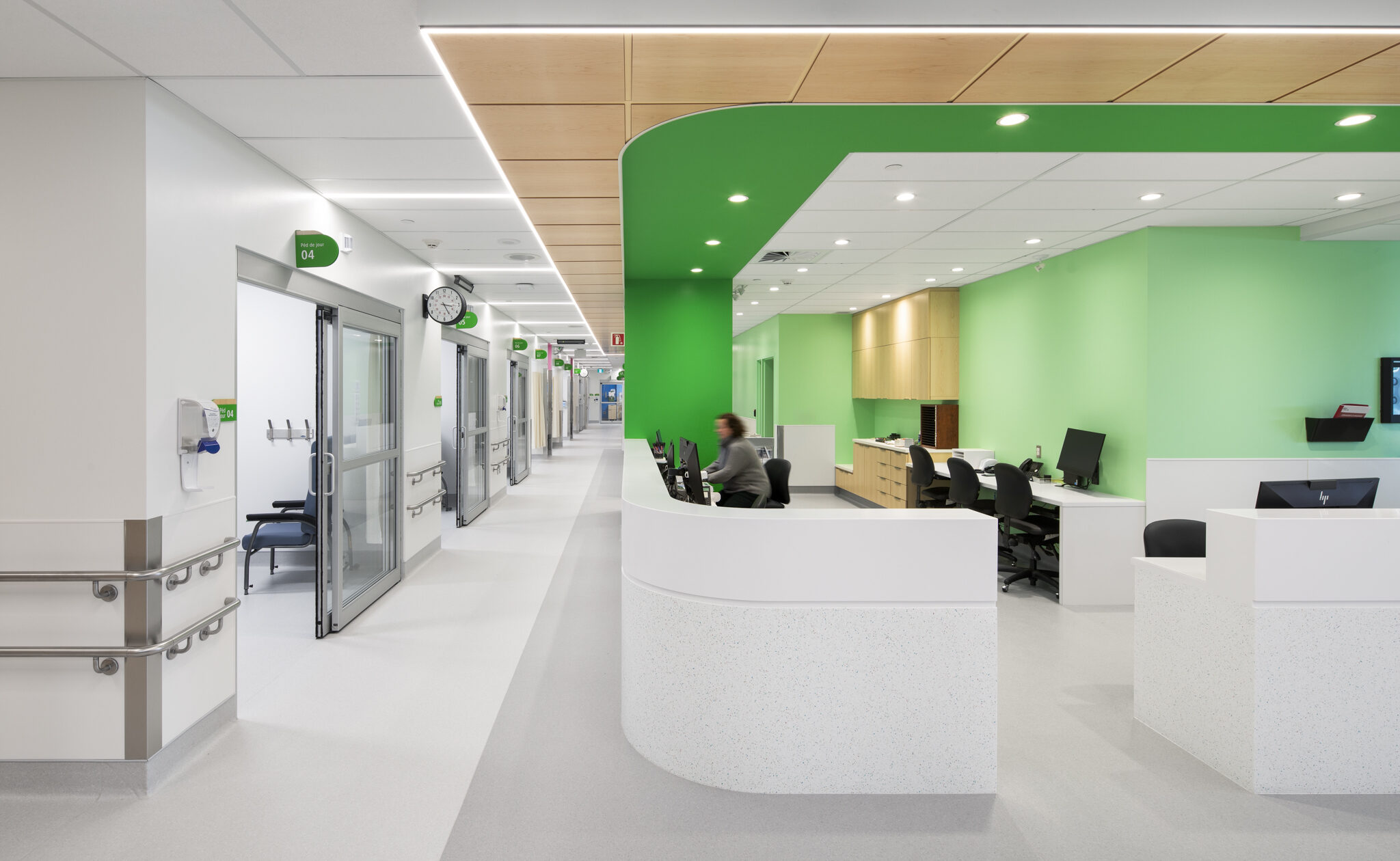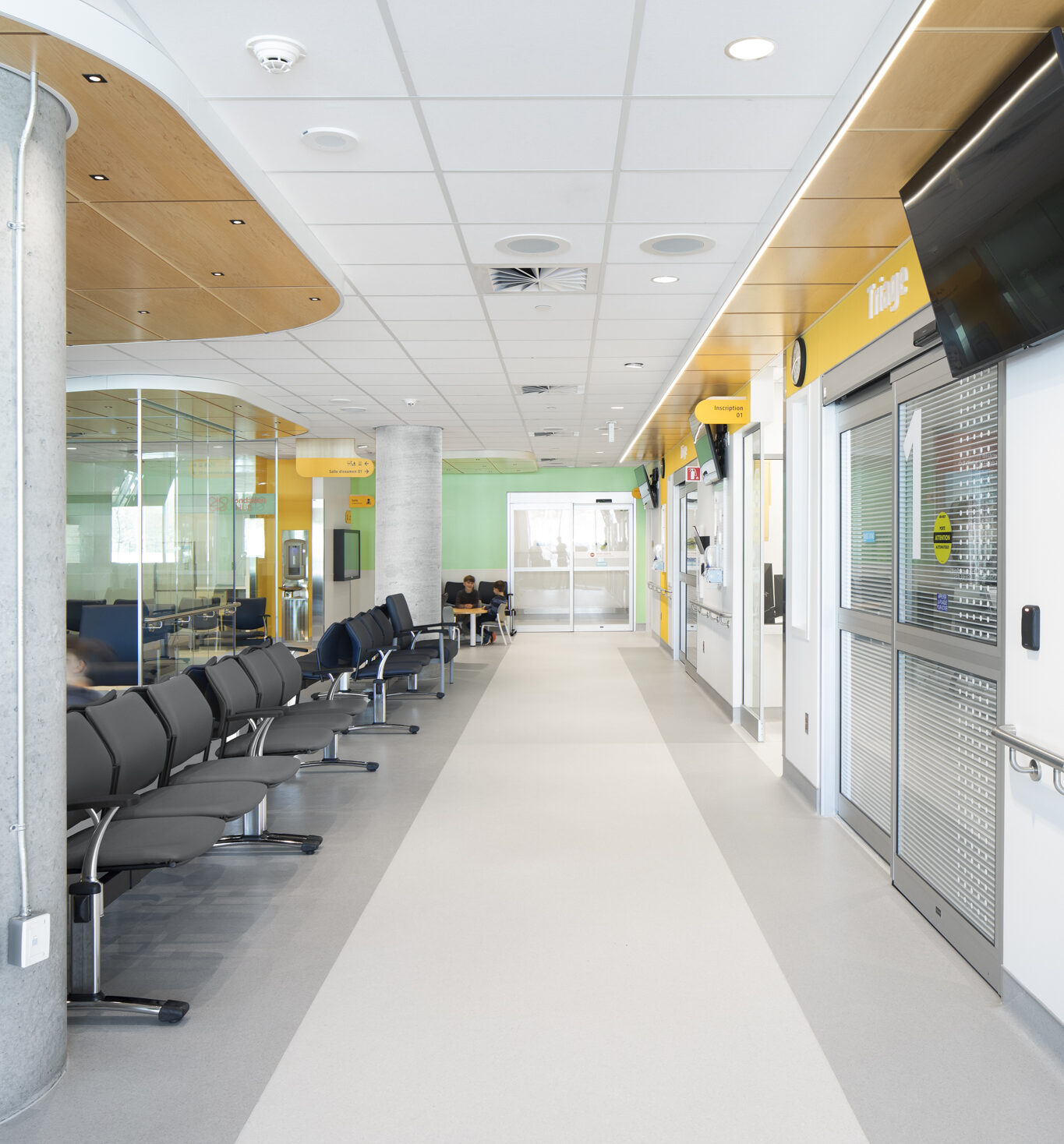 Quant à l’urgence, elle bénéficie désormais d’espaces plus vastes et mieux adaptés aux besoins du personnel comme des patients. L'établissement souhaitait désencombrer les corridors, minimiser la pollution visuelle et sonore et optimiser l'organisation des soins. Les nouvelles installations incluent entre autres une aire de choc modernisée, une zone d'évaluation rapide, 11 salles d'examen, des salles à pression négative et plus encore. La salle d’attente, plus grande, lumineuse et accueillante, offre un environnement apaisant et fonctionnel. L’ajout de salles d’observation et d’une entrée réservée aux ambulances, distincte de la zone d’attente, permet de réduire les perturbations et d’améliorer la fluidité des déplacements. Les chambres spacieuses favorisent l’efficacité du travail clinique tout en préservant l’intimité et le calme des usagers.