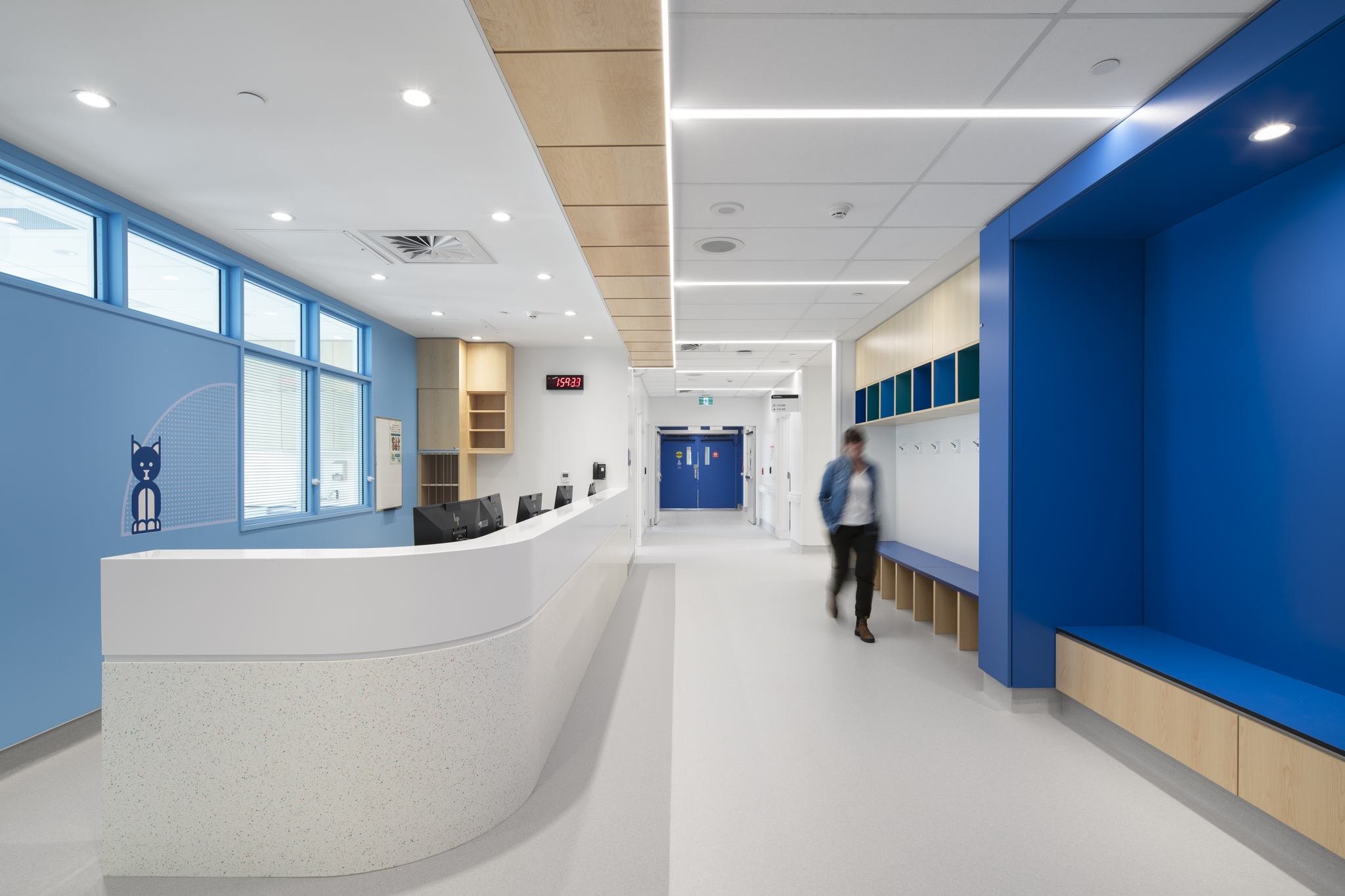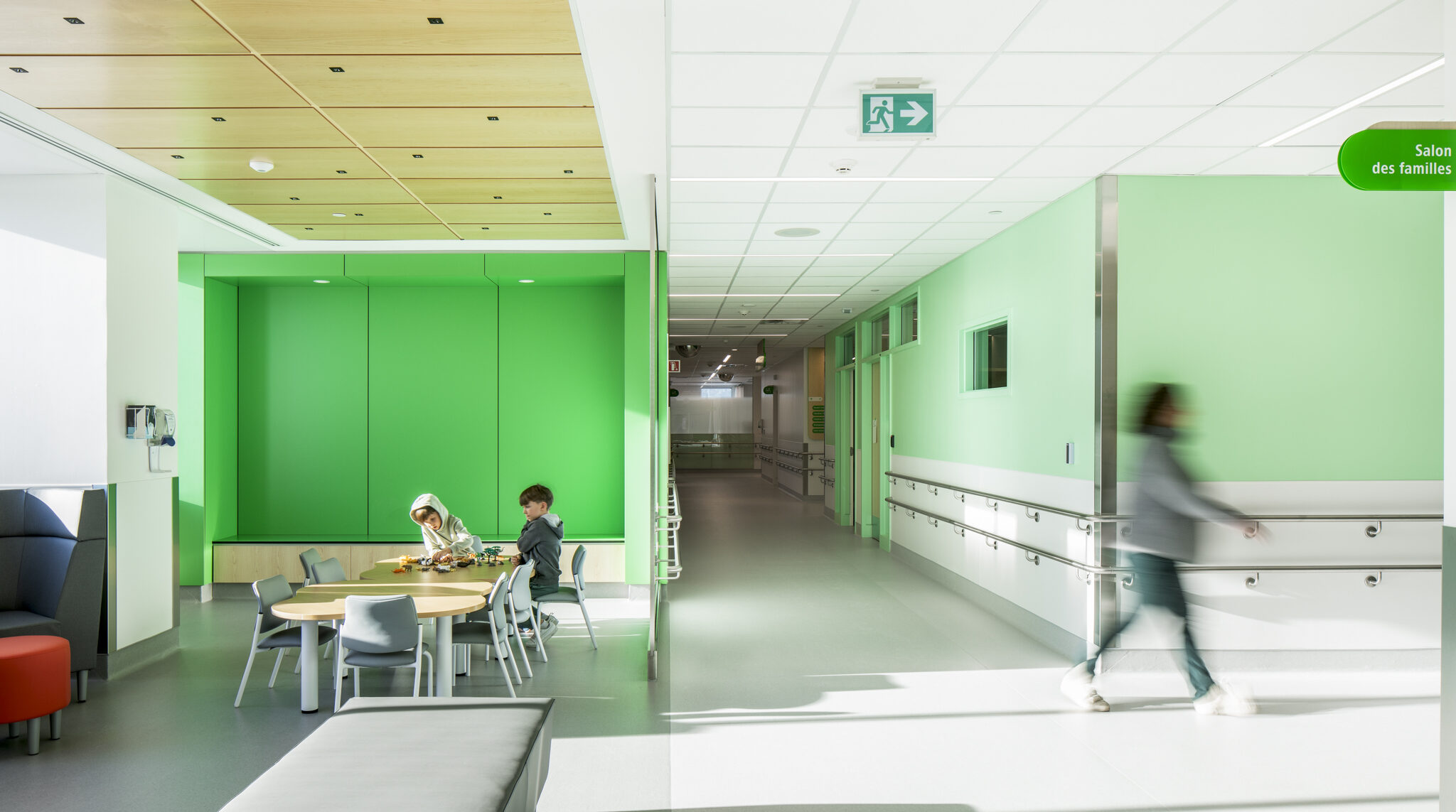 Les espaces du Pavillon Enfant Soleil ont été conçus pour offrir un environnement chaleureux, calme et rassurant. L’aménagement distingue clairement la zone d’hospitalisation de celle des soins intensifs, limitant ainsi les dérangements pour les patients en convalescence. Des chambres individuelles pour les nouveau-nés, des espaces familiaux apaisants, des parcours clairs et lumineux ainsi qu’une cour intérieure entièrement aménagée favorisent la qualité de vie et soutiennent les visées thérapeutiques. Le design intérieur, enrichi par des accents colorés – peinture, murales et éléments décoratifs à la réception – contribue à créer une ambiance vivante et accueillante, propice au réconfort et à la guérison.